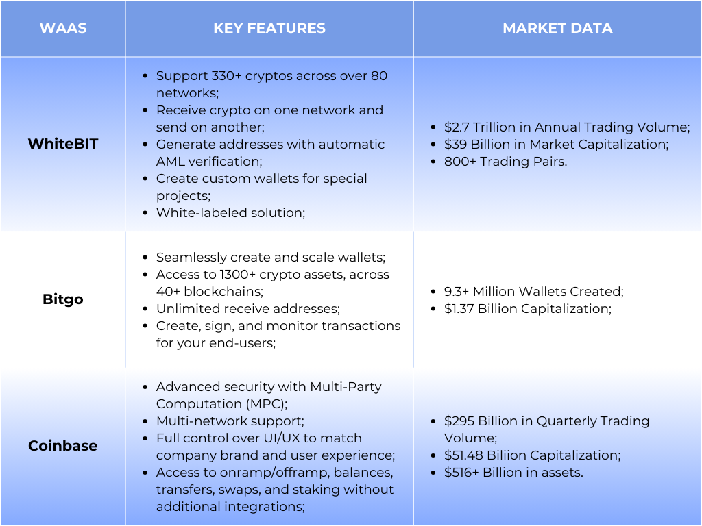 目前市场上已有多个成熟WaaS提供商,可按需选择并集成,为项目快速上线提供可靠支撑。