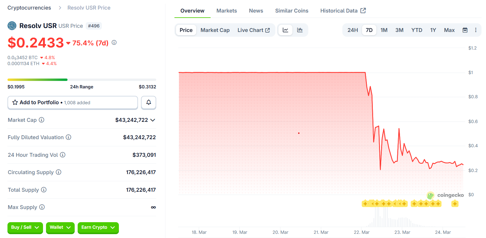 Resolv Labs协议于周日遭遇恶意攻击,攻击者在未提供任何抵押的情况下生成了8000万枚无担保代币,直接导致其美元挂钩稳定币USR出现严重脱锚现象,最低价曾触及0.14美元。