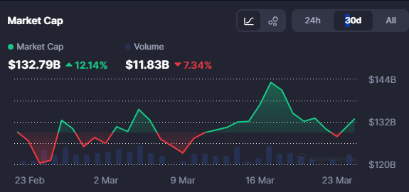 与此同时,代币化现实世界资产(RWA)价值于3月20日达到约18.2亿美元的历史峰值。