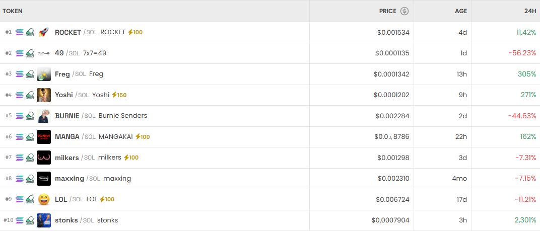 当前去中心化金融领域中,多个新兴交易对引发市场高度关注,其中ROCKET/SOL、49/SOL与Freg/SOL成为焦点标的。数据显示,ROCKET/SOL以0.001517美元的价格占据趋势榜首,24小时内攀升10.20%;49/SOL报价为0.0001138美元,但出现56.13%的显著回调;相比之下,Freg/SOL则录得312%的惊人增长,价格达0.0001366美元,位列第三。