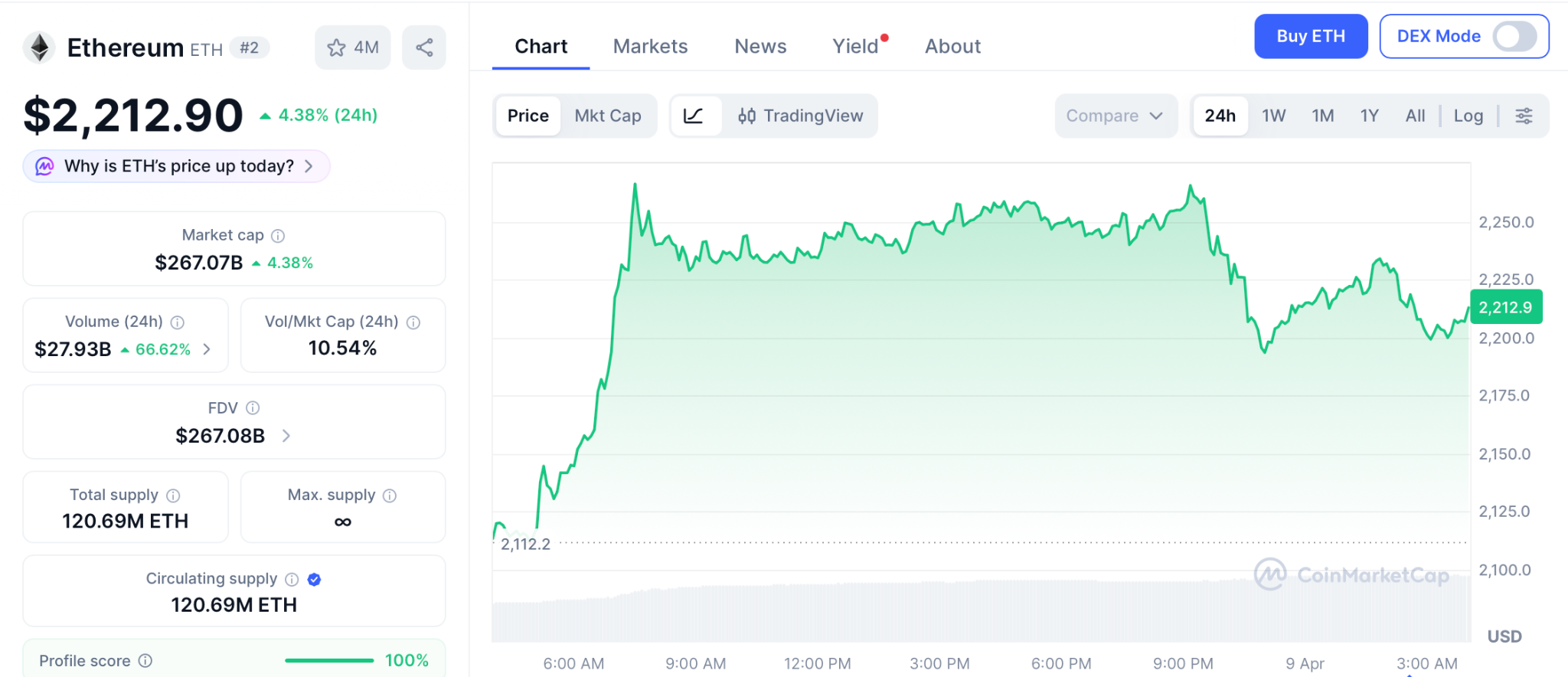 根据CoinMarketCap数据,以太坊在4月8日上涨7.4%后报收2,212美元。过去十天内,巨鲸账户净增持129万枚ETH,显示大资金持续加码。渣打银行目标价定为7,500美元,暗示中期上行空间广阔。从当前价位至5,000美元需约120%涨幅,路径清晰但需时间酝酿。