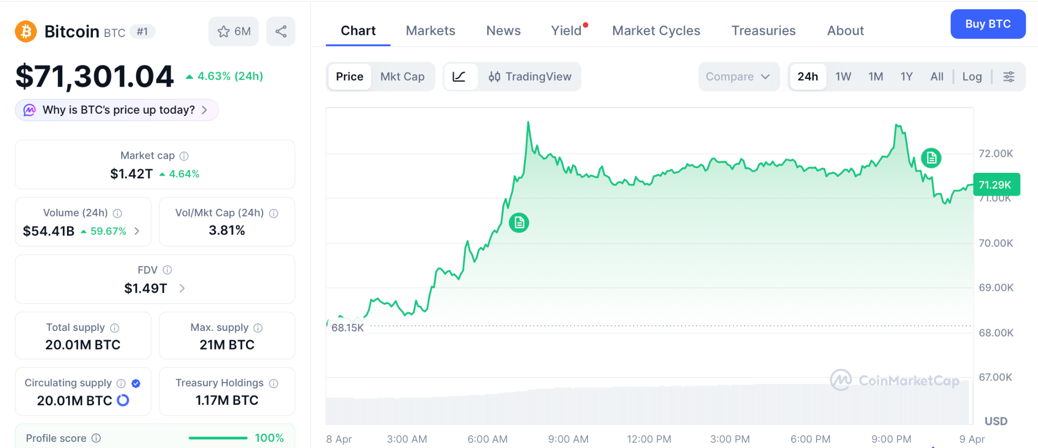 4月8日,美伊停火消息缓解通胀预期,原油价格首次跌破100美元,带动比特币单日上涨4.63%。加密货币整体市值同步回升至2.52万亿美元以上,市场信心显著增强。