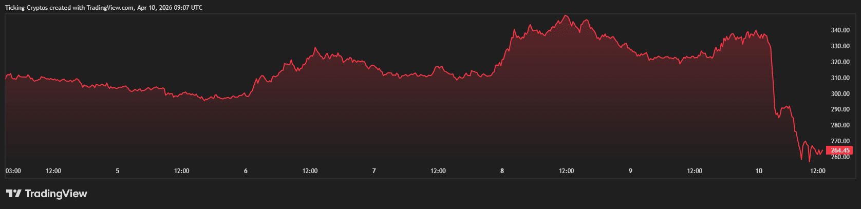 截至2026年4月10日,Bittensor(TAO)报价已跌至263美元,24小时跌幅达19%。剧烈波动引发连锁反应,超过900万美元的多头仓位被强制平仓。此前传出的Covenant AI抛售3.7万枚TAO(价值超千万美元)消息进一步加剧恐慌情绪,形成负反馈循环。