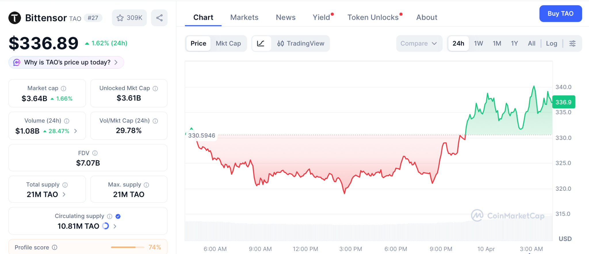 截至4月9日,Bittensor价格回落至336美元,较此前下跌6%。然而,Grayscale将其AI基金中TAO的配置比例上调至43%,并提交独立现货ETF申请,显示机构信心增强。该网络涵盖129个子网,市值达36亿美元,但估值从337美元至633美元仅实现2倍增长,远未触及最具爆发力的1000倍潜力。