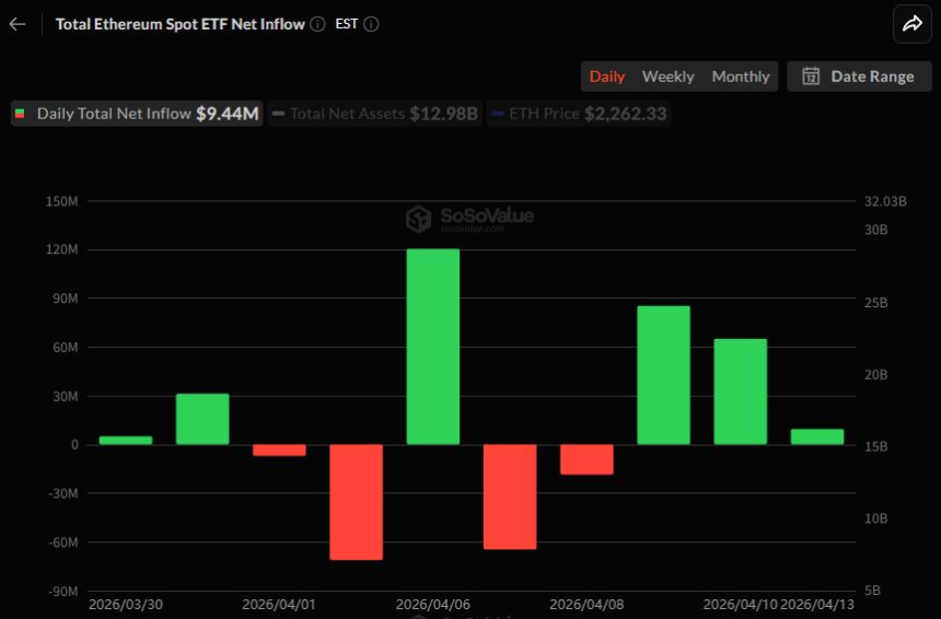 最新数据显示,截至4月13日(当地时间),美国以太坊现货ETF市场单日录得944万美元的资金净流入。继前两日分别实现8519万美元与6495万美元的流入后,该趋势已连续维持三个交易日,累计净流入金额攀升至116.8亿美元。
