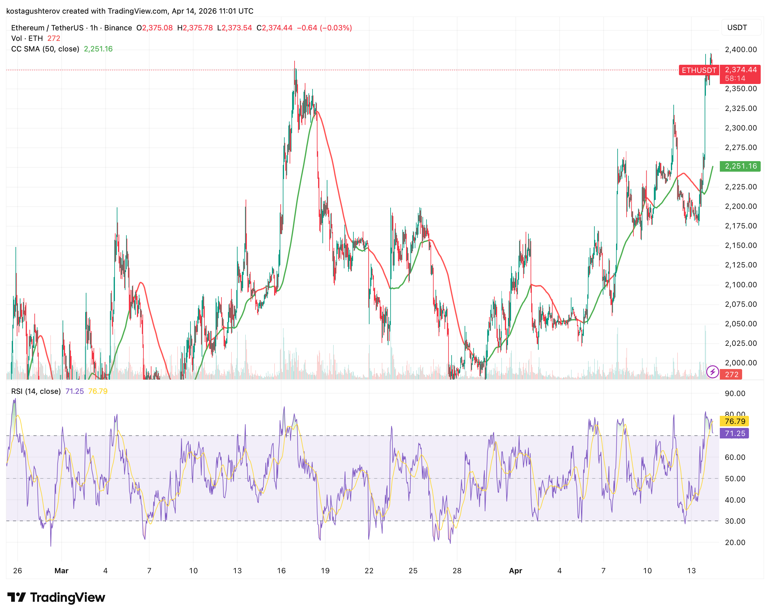 当前以太坊交易价为2374美元,较前一日上涨8.6%,成功突破2000美元关键支撑位,形成自3月中旬以来首次明确的均线多头排列。50日简单移动平均线位于2251美元,价格领先该均线123美元,技术面呈现积极上行态势。