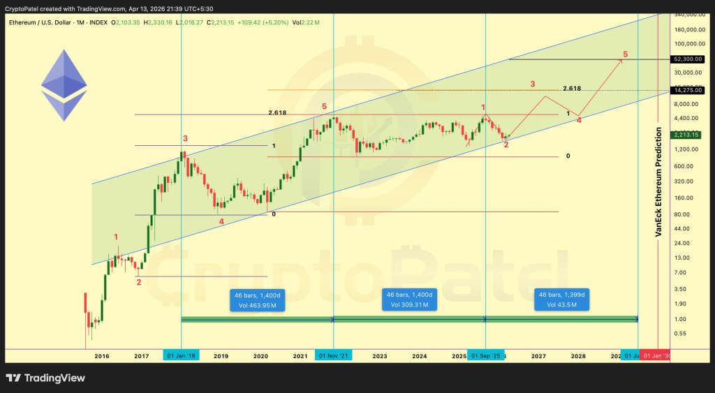 全球资产管理巨头VanEck发布最新报告,预计以太坊在2030年有望攀升至52,300美元水平,较当前约2,213美元的价位实现超2,200%的涨幅。该预测由CryptoPatel于4月13日发布的月度ETH/USD对数图表支撑,展现出清晰的长期增长轨迹,正值加密市场持续回暖之际。