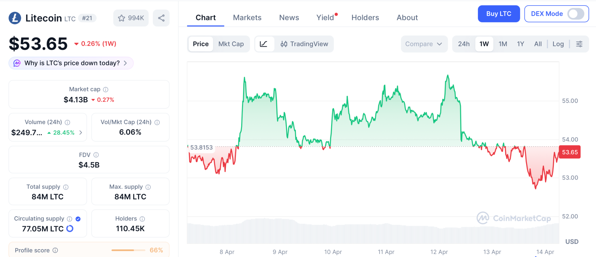 LTC现价53.65美元:商品认定难掩深度回调