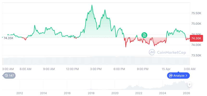 据最新数据显示,截至4月15日12时04分,比特币报价为74,342.34美元,与前一日基本持平;以太坊则录得2,325.12美元,跌幅达1.83%。