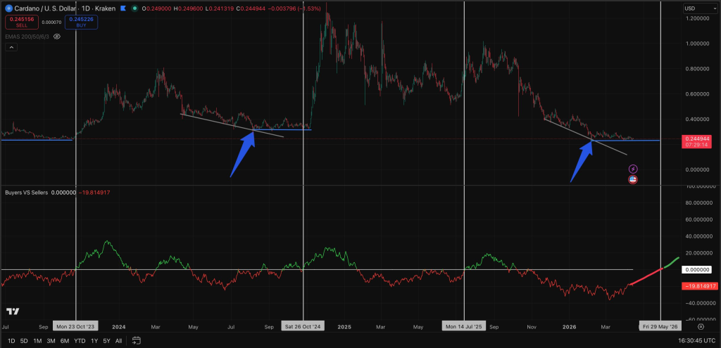 摘要:卡尔达诺(ADA)现价0.24美元,虽处熊市低位,但分析师瑞克·麦克拉肯指出其关键指标“买家与卖家斜率”已转正,预示五月末或六月初或迎突破。结合峰会预算与机构ETP进展,市场情绪渐暖。