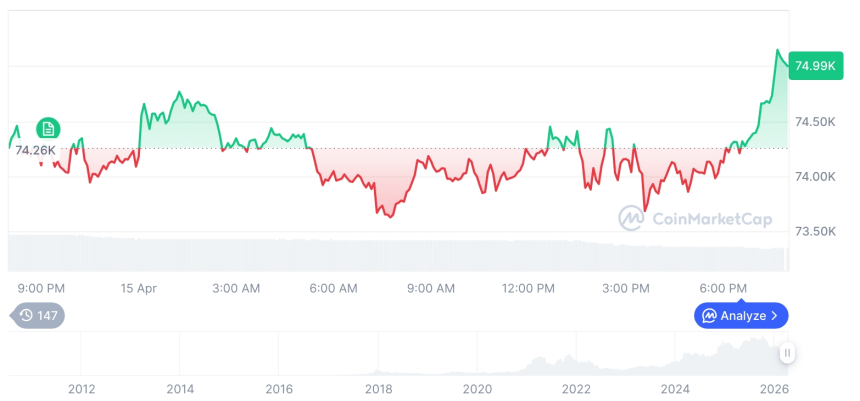 截至4月16日下午2时04分,比特币报价达75066.50美元,较前一日上涨1.08%;以太坊同步攀升至2376.30美元,涨幅为2.67%。多数主流山寨币亦录得正向波动,整体市场情绪趋于乐观。
