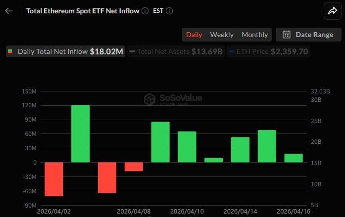 最新数据显示,截至4月16日,美国以太坊现货ETF市场实现单日净流入1802万美元。在连续六个交易日保持资金流入后,累计净流入额已攀升至118.2亿美元,显示市场对以太坊金融化产品的持续信心。