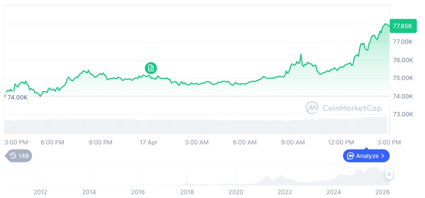 摘要:比特币价格站上7.8万美元关口,以太坊同步上涨超5%,主流山寨币集体走强。市场总市值突破2.6万亿美元,头部资产占有率持续提升,资金集中趋势明显。