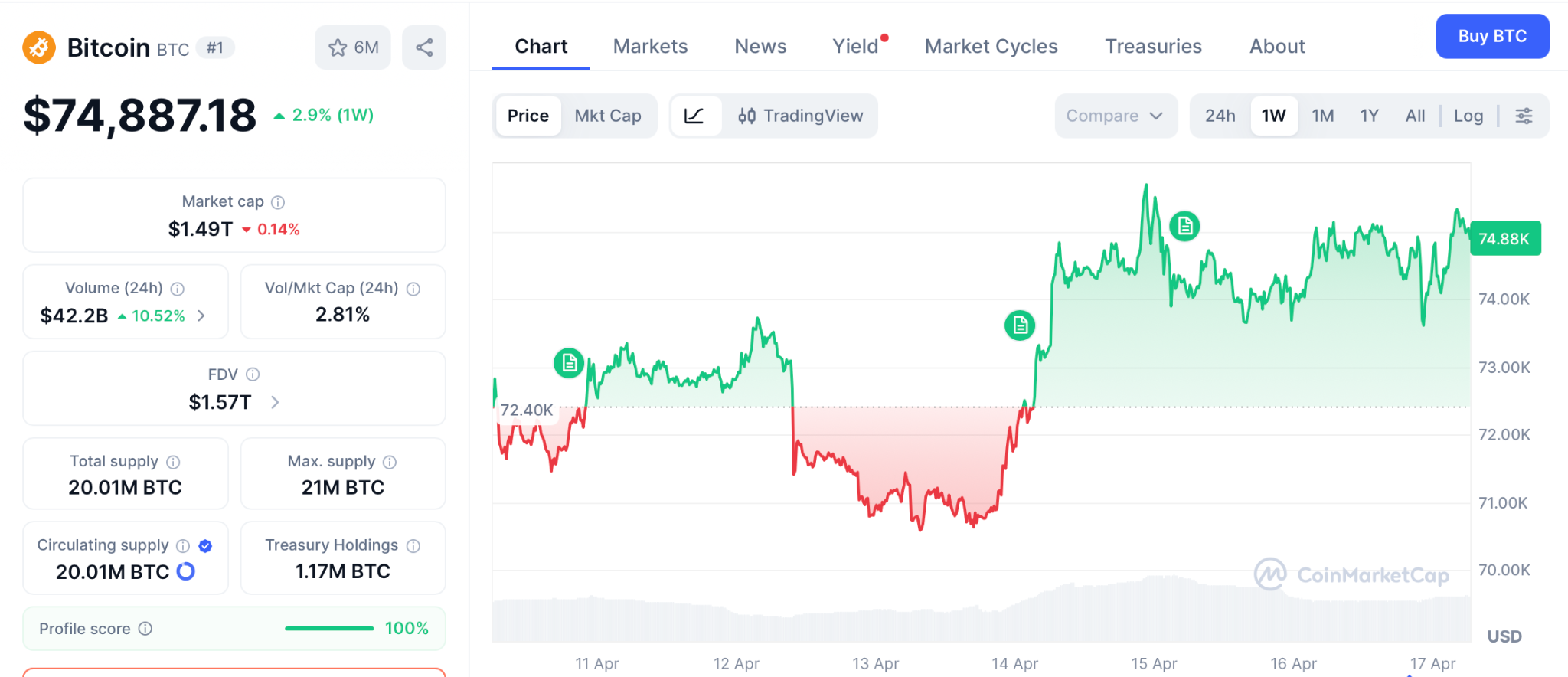 根据CoinMarketCap数据,比特币现价为74,887美元,日内上涨0.89%。摩根士丹利MSBT ETF持续吸金,现货比特币ETF总规模维持在950亿美元。连续多日的负资金费率表明市场悲观情绪积聚,或预示即将迎来强劲反弹。
