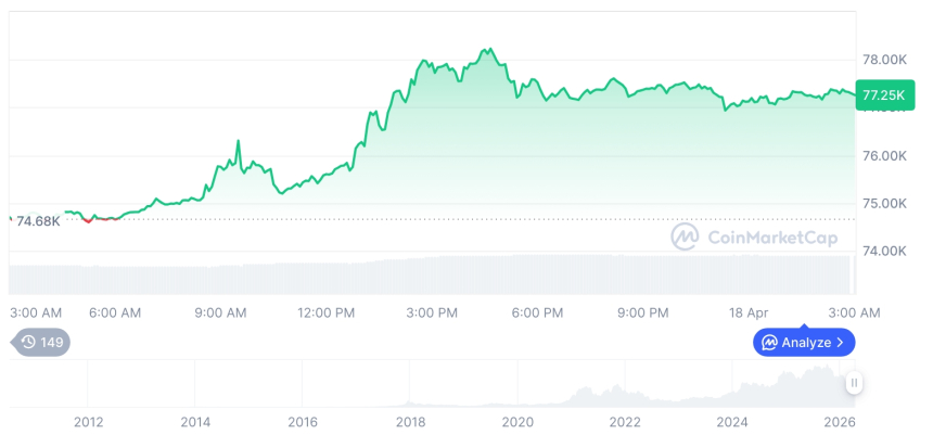 截至4月18日中午12时04分,比特币价格达77,311.18美元,较前一交易日上涨3.49%;以太坊同步攀升至2,418.80美元,涨幅为3.73%。两大核心资产的强劲表现带动整个加密生态回暖。