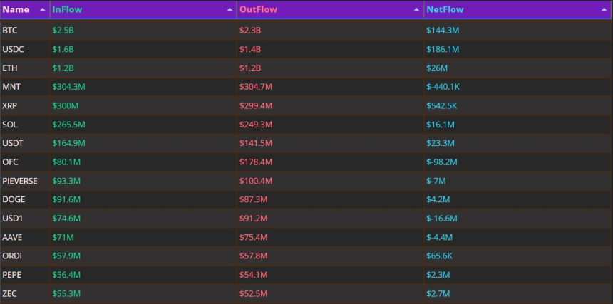 从资金净流入排名看,USD Coin以1.861亿美元居首,紧随其后的是比特币、以太坊、Tether及SOL。与此同时,部分资产遭遇资金撤离,其中OFC以9820万美元净流出位居前列,此外USD1、PIEVERSE、AAVE与MNT等亦出现资金外流现象。