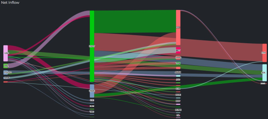 在最近五个小时内,比特币市场呈现持续资金净流入态势,而以太坊则遭遇明显资金外流。与此同时,法币兑换行为尤为突出,其中韩元的转换活动成为关键观察点。