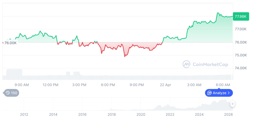 摘要:截至4月22日,比特币涨至7.8万美元,以太坊突破2390美元,主流币种齐涨。市场总市值逼近2.6万亿美元,头部资产占有率持续提升,衍生品交易活跃度显著上升,反映投资者风险偏好回暖。