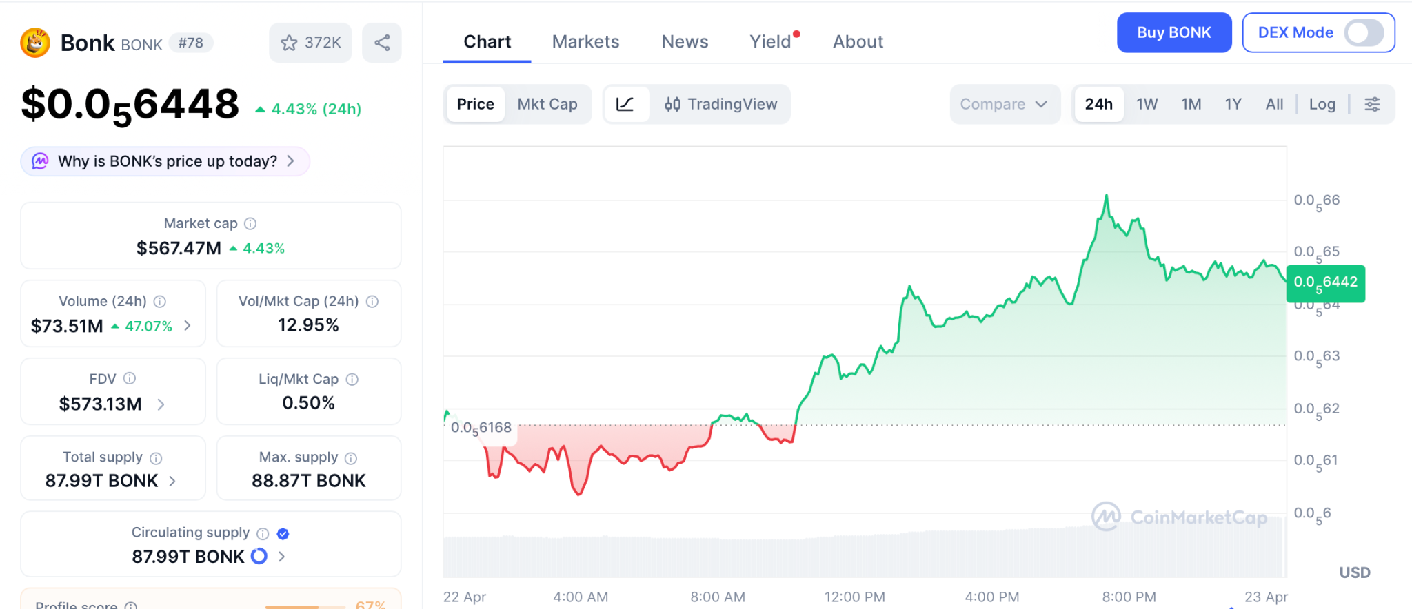 根据CoinMarketCap最新数据,Bonk在2026年第一季度实现1044万美元的运营收入,环比增长达45%。其中,LetsBonk.fun平台贡献超过七成收入,彰显其商业化能力已逼近主流中型DeFi项目水平。同时,项目方执行了4.72亿枚代币的回购销毁机制,显著降低市场抛压。