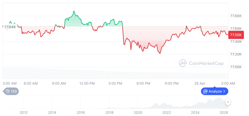加密货币市场维持波动格局。据TokenPost Market数据,截至4月26日中午12点4分(韩国标准时间),比特币报价为77,508美元(约合1,144万韩元),较前一日微跌0.15%;以太坊价格报2,315美元(约合342万韩元),下跌0.13%。多类山寨币呈现明显分化走势。