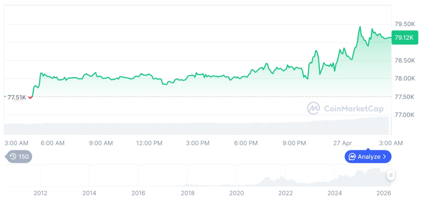数据显示,截至4月27日下午12时4分55秒,比特币价格报79,164.54美元,较前一日上涨2.14%;以太坊报价2,393.83美元,涨幅达3.39%。多数主要竞争币种亦呈现普涨态势,市场整体呈现积极上行格局。