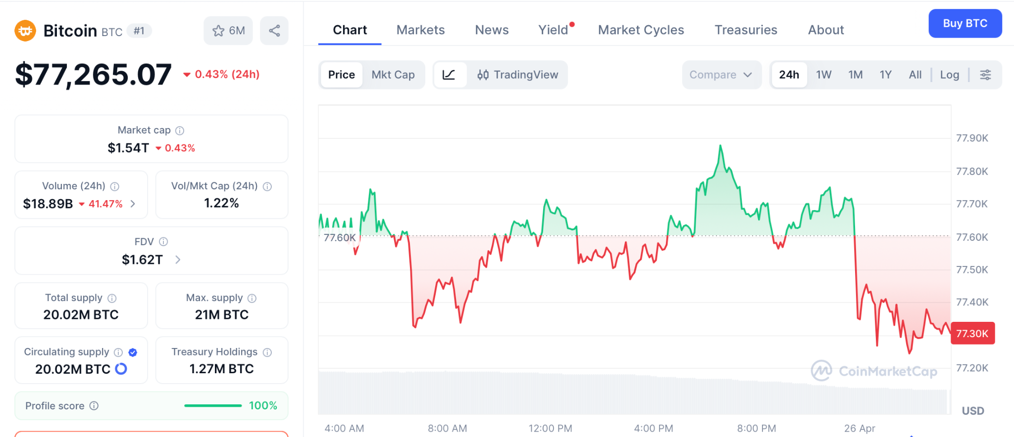 比特币现价77,265美元,运行于76,000至80,000美元区间,连续五日走强。支撑位位于76,000美元,阻力位在80,000美元。若有效突破,将打开通往90,000美元的空间,并进一步挑战历史高点126,198美元,意味着约62%的上涨潜力。