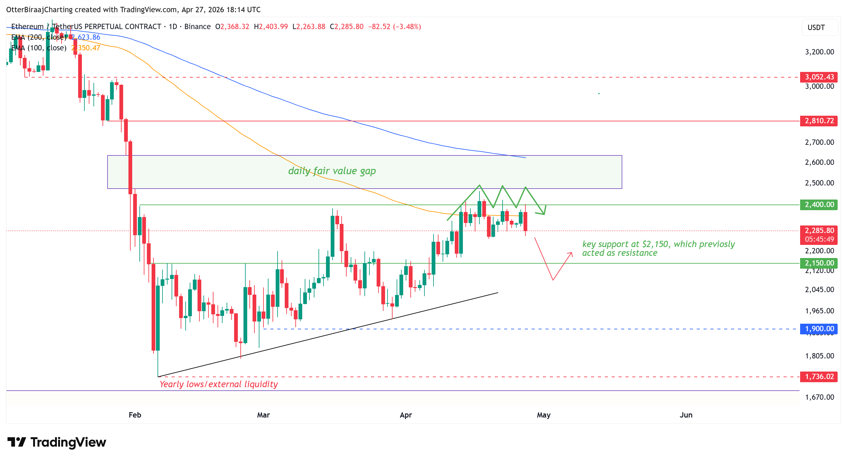 周一,以太坊(ETH)价格下跌3.4%,收于2287美元。这是自4月14日以来第四次在2400美元关键位遭遇抛压并回落。目前价格持续位于100日移动均线下方,且约25亿美元的杠杆多头头寸面临清算风险,集中在2150美元支撑区附近。加密分析师Michaël van de Poppe指出,以太坊对比特币的相对弱势加剧了短期反弹动能的不确定性。