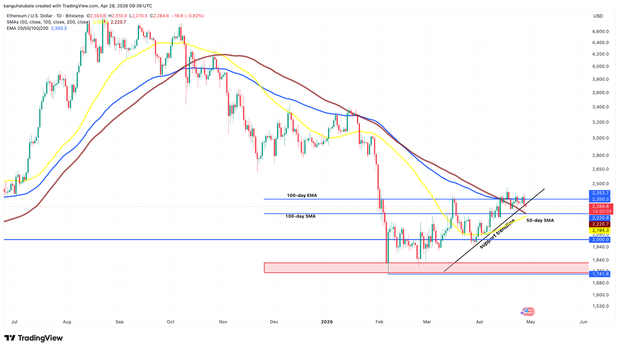 TradingView数据显示,ETH/USD已跌破2300美元关键支撑,过去两日跌幅达5%,完全回吐此前周末全部涨幅。目前价格处于2350美元100日指数移动平均线与2220美元100日简单移动平均线之间,呈现窄幅波动格局。