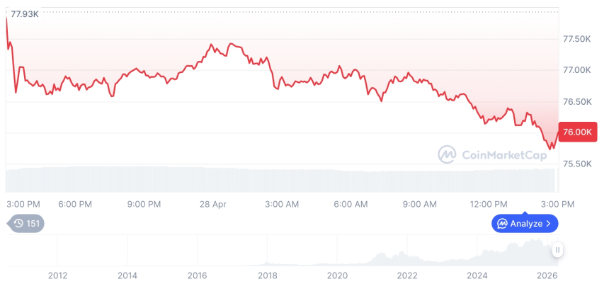 当前加密货币市场整体呈现下行态势。据TokenPost数据,比特币交易价为75,907美元(约合1亿1211万韩元),较前一日下跌2.45%;以太坊报价为2,272美元(约合335万韩元),跌幅达1.83%。