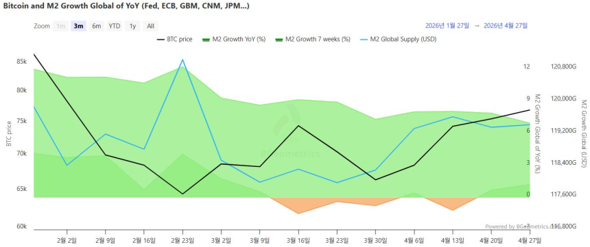 M2作为涵盖现金、活期存款及高流动性金融工具的综合货币指标,是衡量经济体可用资金规模的关键参考。其与比特币价格存在约十周的滞后相关性,被视为“流动性风向标”。