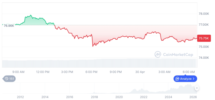 根据TokenPost最新数据,截至4月30日下午4时4分(韩国标准时间),比特币报75,762.88美元,较前一日下跌1.63%;以太坊则录得2,247.34美元,跌幅达3.30%,两大核心资产均出现明显回落。