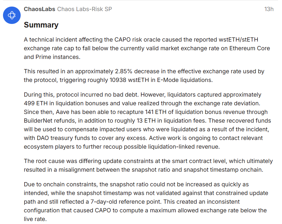 Aave协议因外部风险预言机系统中的技术配置错误,造成价值约2710万美元的封装质押以太币(wstETH)头寸被强制清算。该问题源于快照比率与时间戳不匹配,导致系统采用低于实际市场汇率的2.85%作为定价基准,从而触发了本可避免的清算机制。清算后果与收益归属