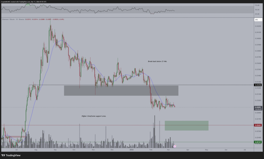 摘要:ETH/BTC交易对延续下行趋势,缺乏突破信号。0.0265 BTC支撑位成为潜在买入点,更高时间框架支撑区域对防止进一步下跌至关重要。