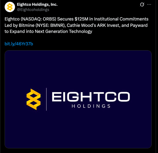 Eightco Holdings宣布获得总计1.25亿美元的机构投资承诺,投资方涵盖加密资产管理公司Bitmine、ARK Invest以及加密货币交易所Kraken的母公司Payward。此次融资标志着公司从早期加密资产持仓转向更广泛的科技领域布局,聚焦人工智能、区块链基础设施与数字消费平台的交汇点。 融资消息发布后,市场迅速作出反应。Eightco股价在交易时段出现显著上行,反映出投资者对公司多元化技术战略的关注度提升。本轮资金将主要用于支持下一代数字服务的发展,强化公司在新兴技术生态中的定位。关键投资方与资金构成