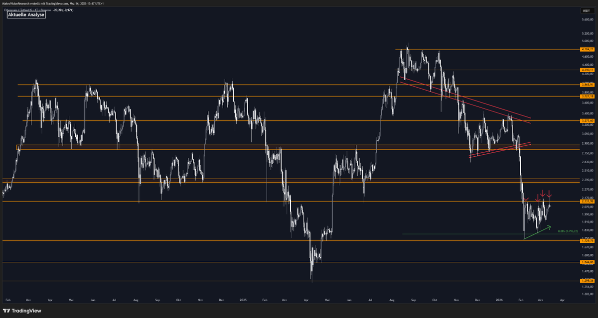从更长周期看,以太坊在年初经历大幅回落之后,在1830美元附近获得买盘支撑,多头开始构筑反弹基础。此后价格多次尝试向上拓展,却均在2130美元区域遭遇压制,导致该位置成为当前短期趋势的核心控制点。