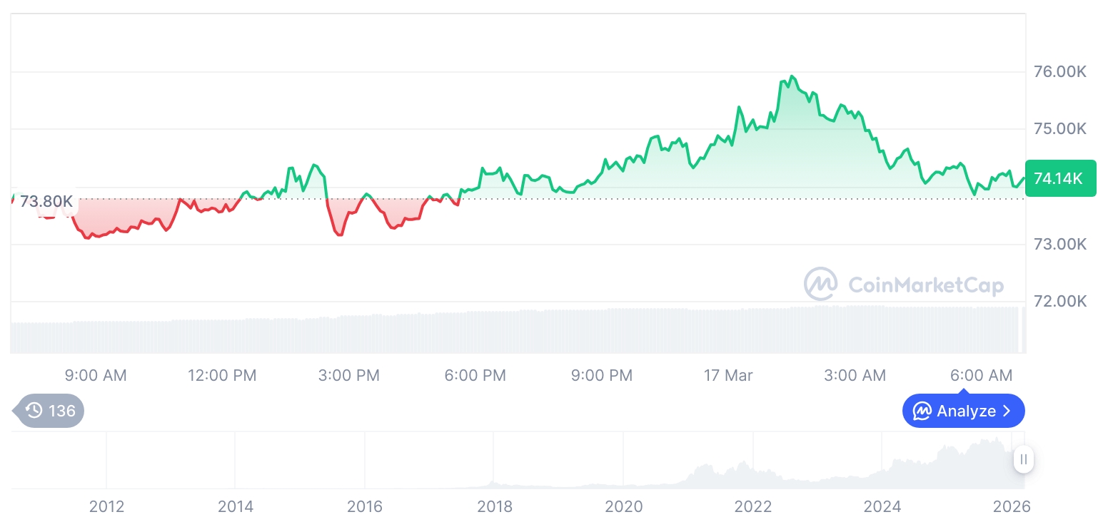 最新数据显示,比特币当前报价为74,082美元,较前一交易日上涨0.45%。以太坊则表现强劲,报收于2,315美元,实现2.38%的明显增长。