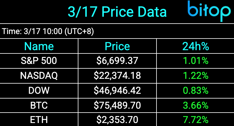 比特币今晨成功站稳7.5万美元关口,创下新纪录。上周,美国上市的12只比特币现货ETF合计净流入超7.67亿美元,3月累计净流入已达13亿美元。此外,MicroStrategy宣布斥资近16亿美元增持比特币,为自今年初以来最大一笔买入,其母公司股价随之上涨5.6%。