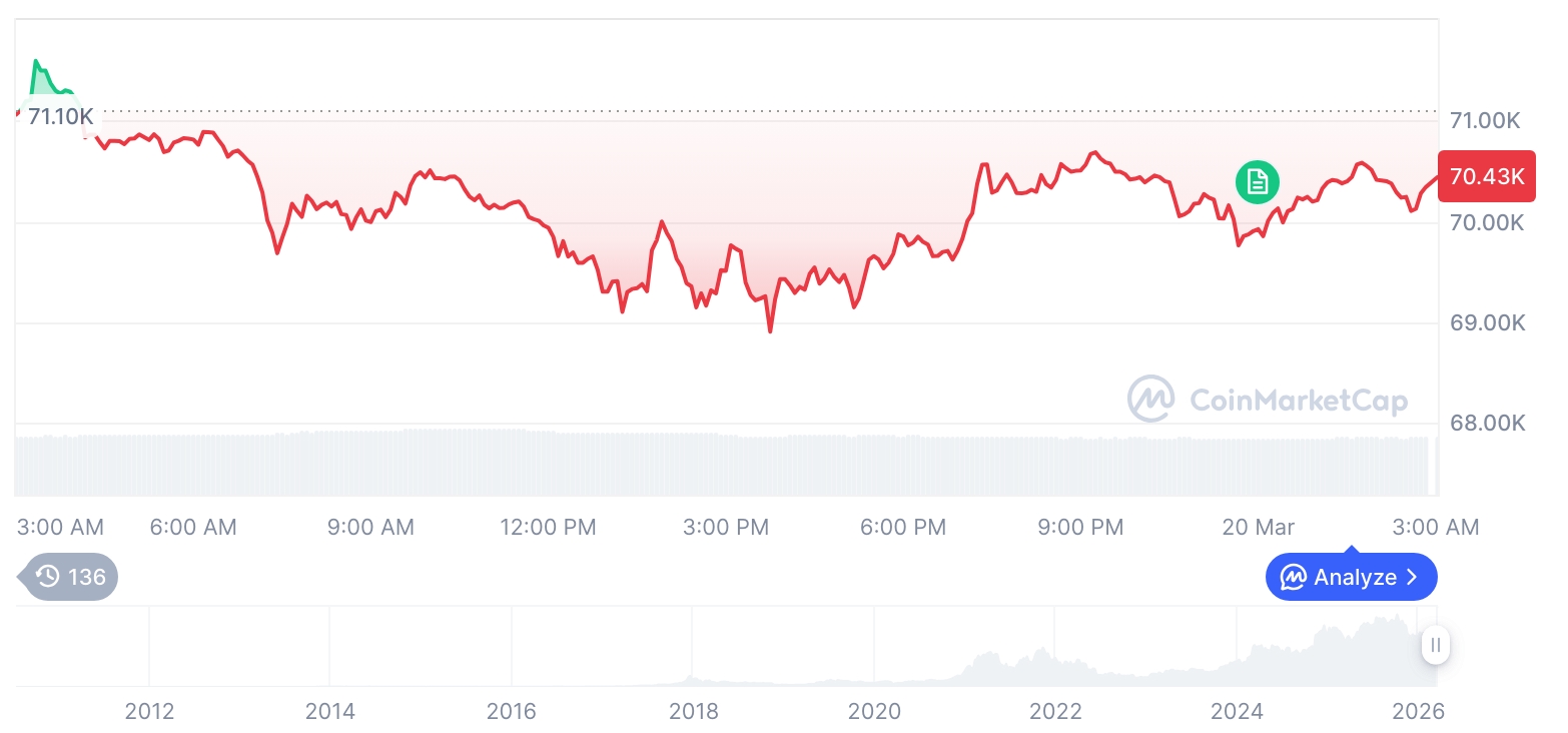 摘要:比特币价格回落至70,423美元,以太坊跌超2%,主流山寨币普遍承压。市场总市值维持在2.41万亿美元,衍生品与稳定币板块同步走低。