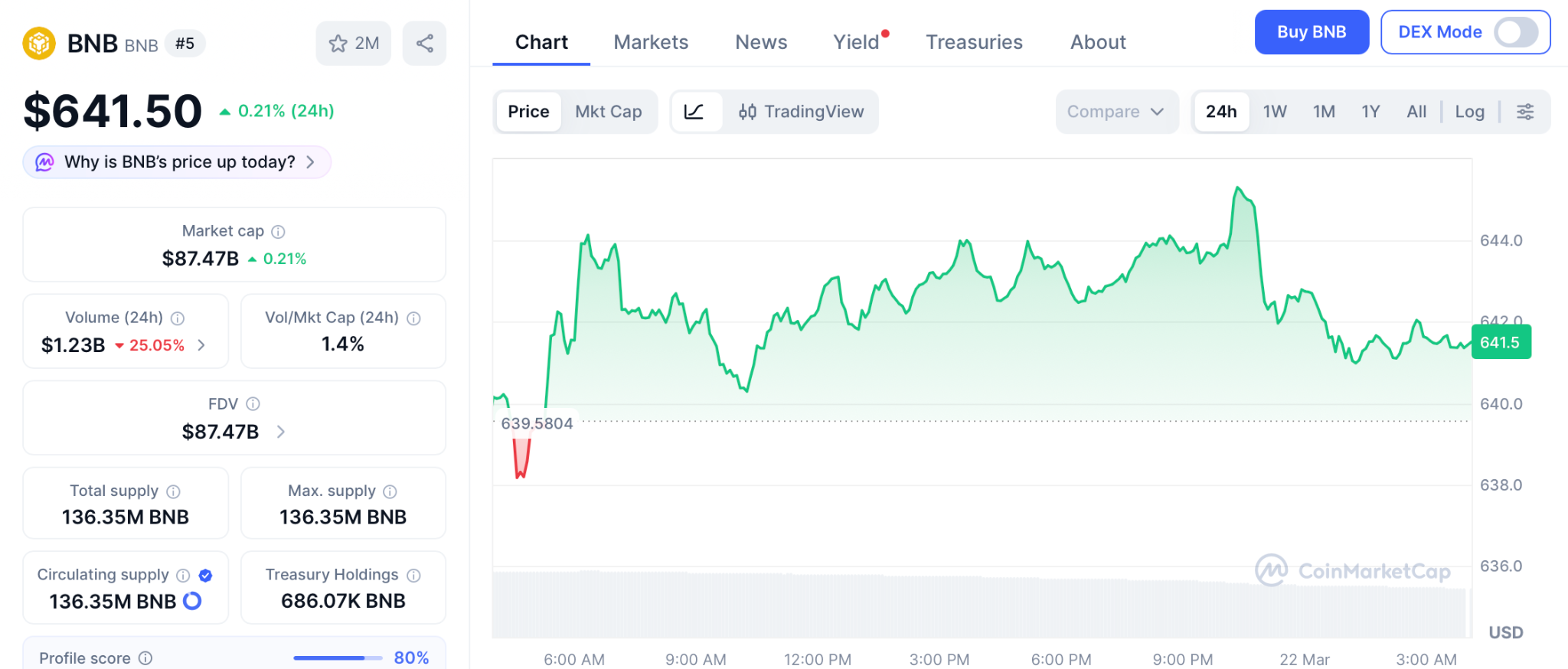 据CoinMarketCap数据,当前BNB交易价为641美元,较2025年底创下的1370美元历史峰值回落约53%。