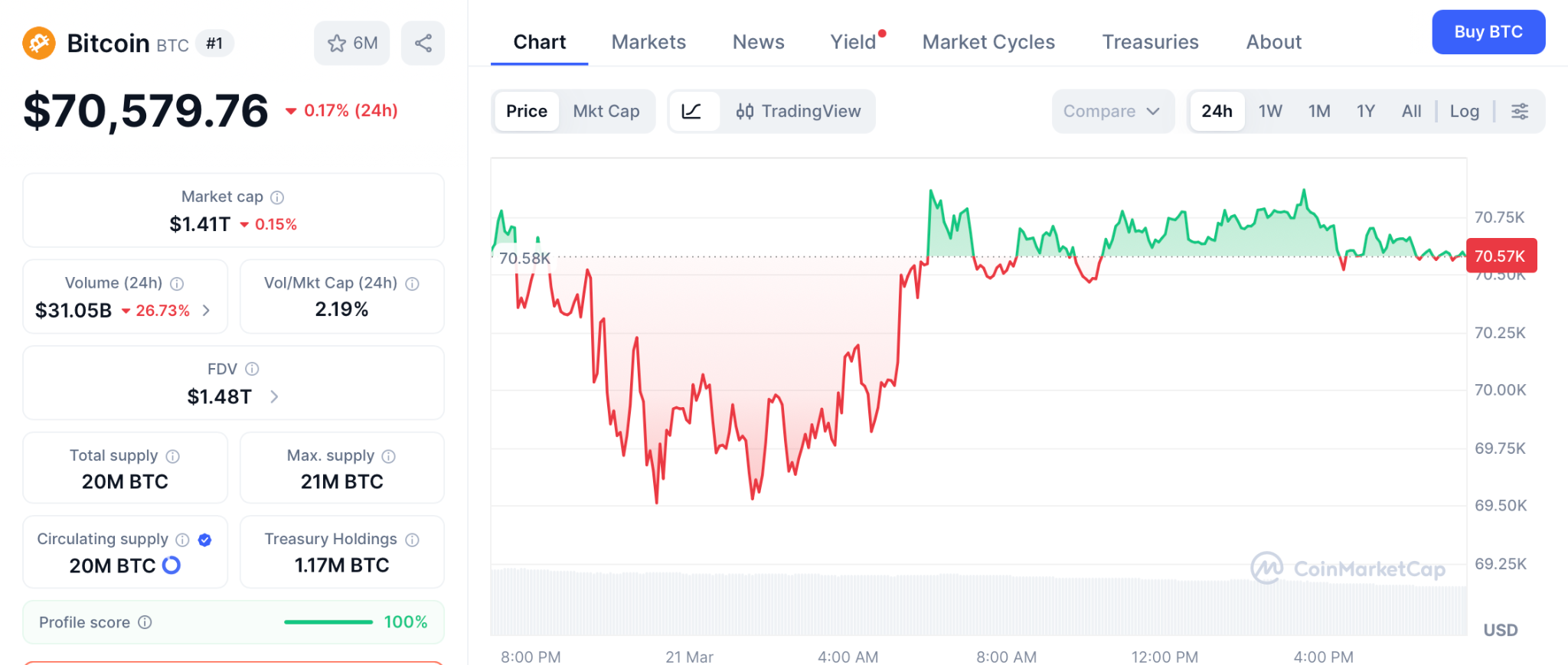 根据CoinMarketCap数据,3月21日比特币报价为70,579美元。摩根士丹利已提交其现货比特币ETF申请(MSBT)。从当前价位看,花旗集团目标价112,000美元,对应约59%上行空间,属稳健保值选择。