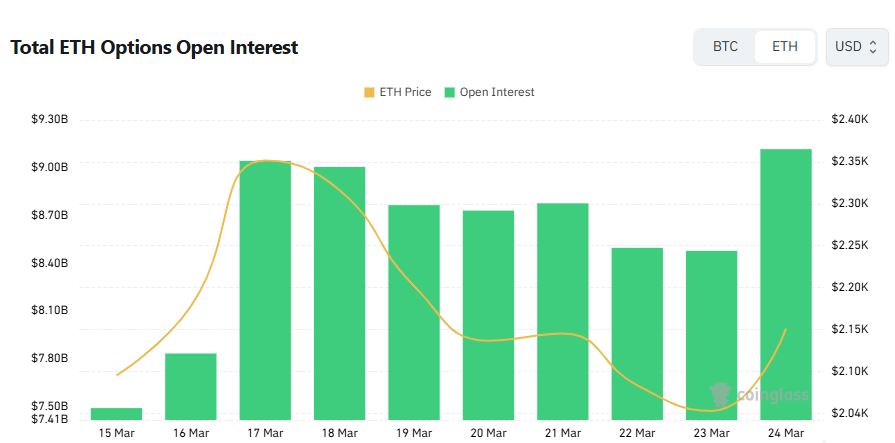 截至24日上午9时,以太坊期权市场未平仓合约总额达91.2亿美元,较前一日上涨约7.55%,显示投资者对中期价格走势的参与度显著提升。