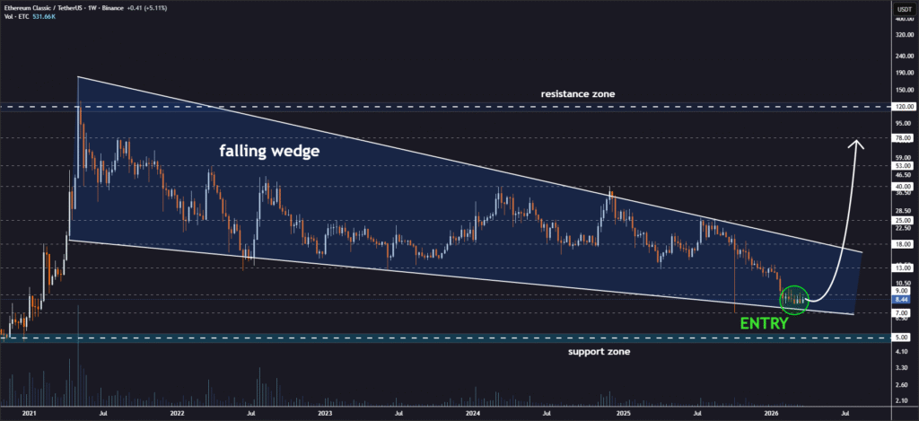 以太经典价格在下降楔形中稳固支撑,酝酿潜在突破