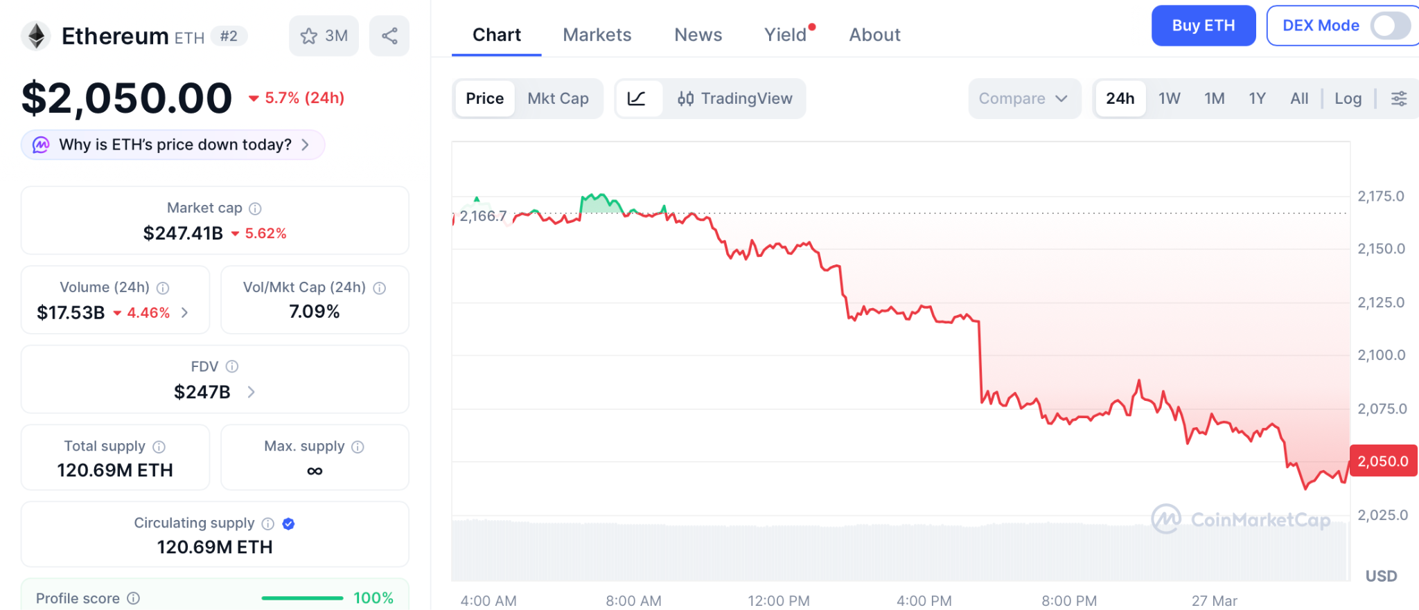 根据CoinMarketCap数据,截至3月27日,以太坊交易价为$2,050,仍守于$2,000支撑位上方。当前,其在DeFi与AI赛道的表现优于比特币,未平仓合约规模处于多月高位,显示市场参与度持续攀升。
