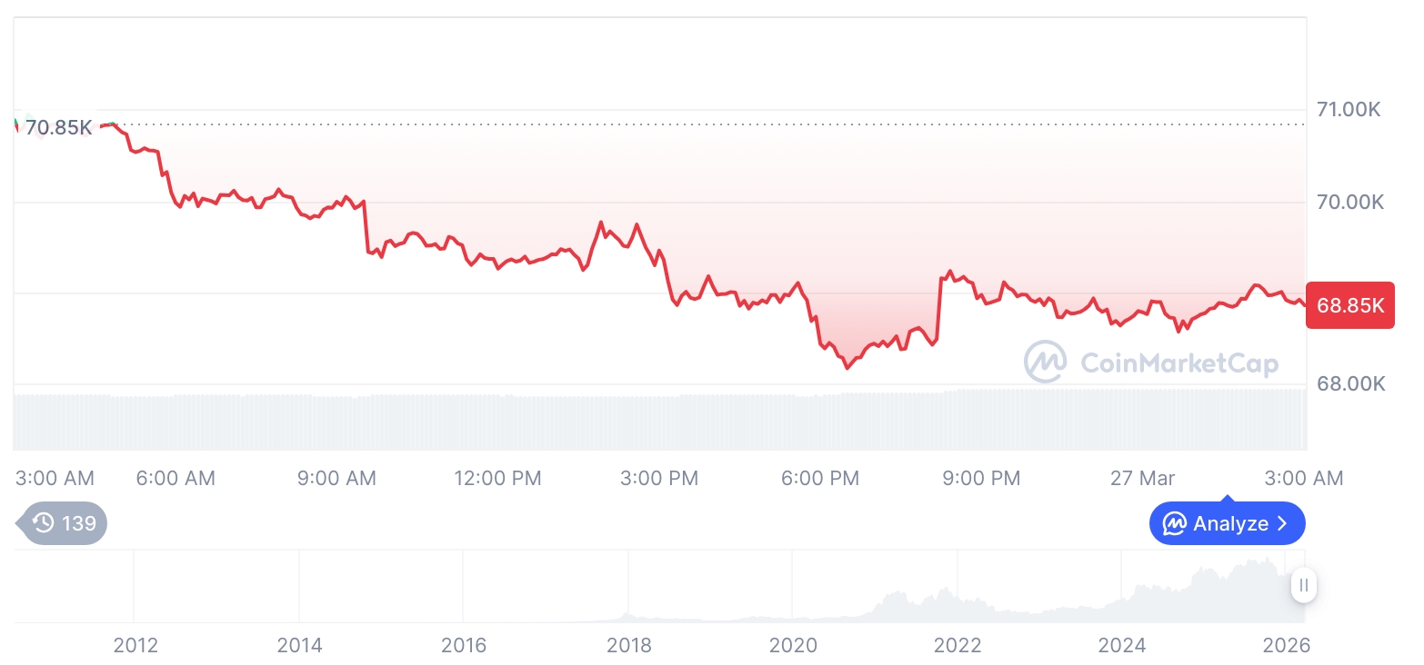 最新行情显示,比特币价格报68,873美元(约合人民币49.9万元),较前一交易日下滑2.83%。与此同时,以太坊报价为2,067美元(约合人民币1.5万元),跌幅达3.80%,市场情绪偏弱。