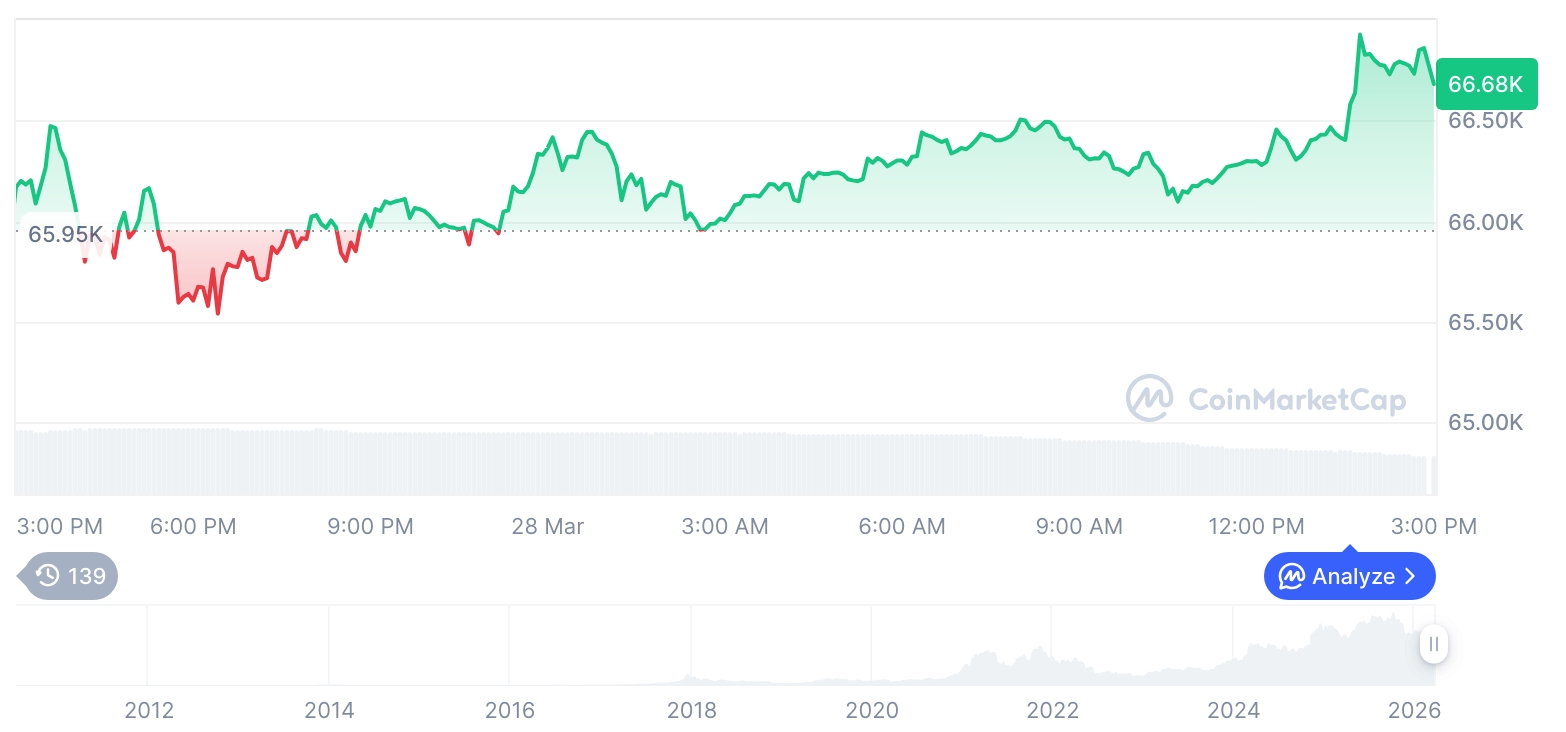 加密货币市场今日维持波动状态,比特币价格较前日攀升0.819%,报收于66,710美元(约合1.079亿韩元)。以太坊则上涨1.583%,达到2,019美元(约合305万韩元)。