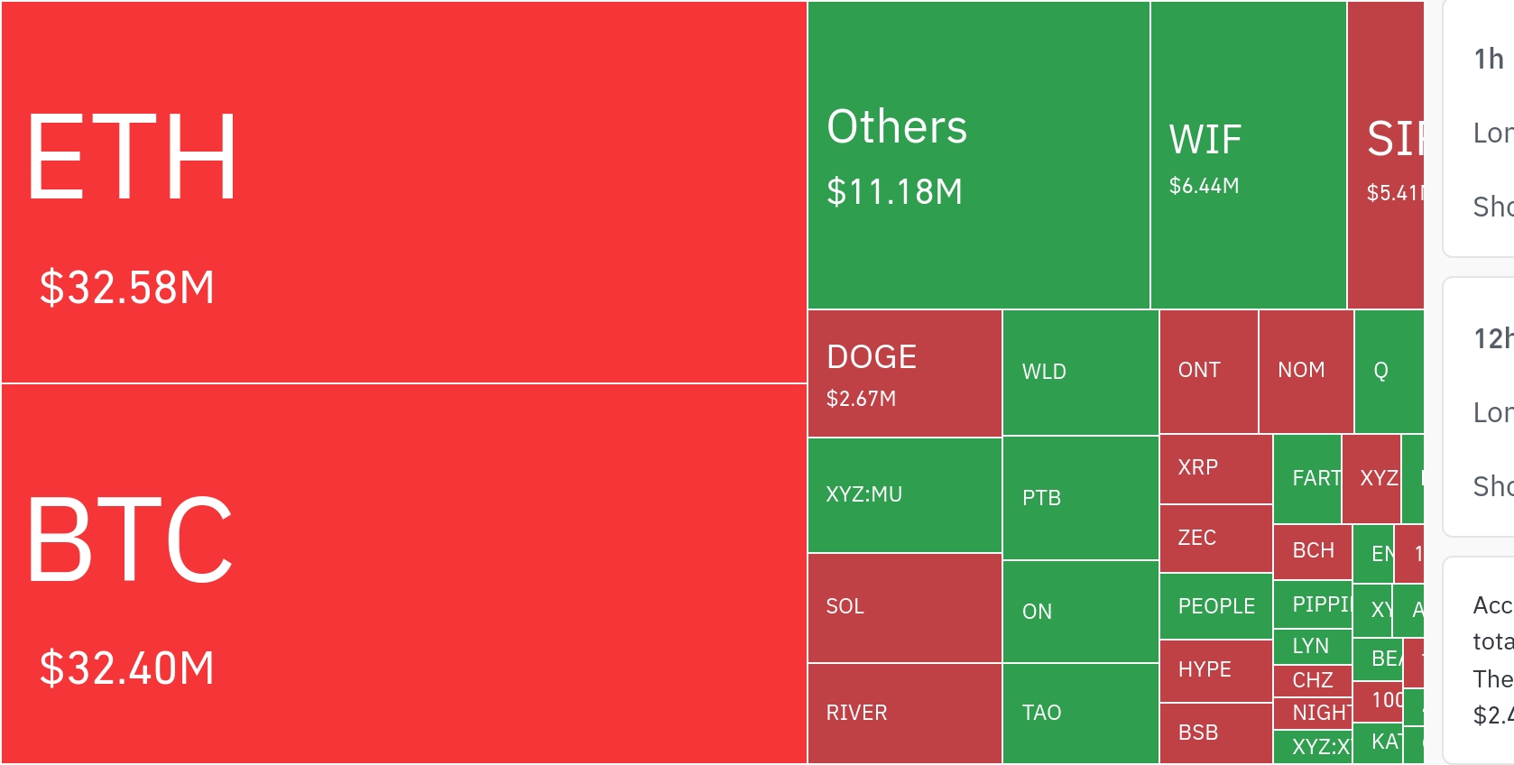 从币种维度看,以太坊相关头寸的清算金额最高,达约3258万美元。该数值与比特币的清算额几乎持平,凸显其在高杠杆交易中的核心地位。