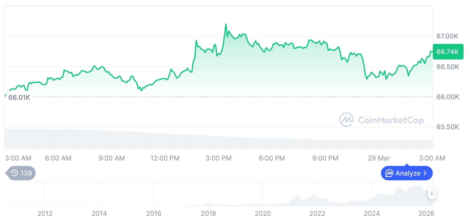 当前加密货币市场整体维持波动格局。据TokenPost最新数据显示,比特币价格报66,747美元(约合1亿81万韩元),较前一日回升1.13%。以太坊则上涨至2,007美元(约合303万韩元),涨幅达1.08%,显示多头动能逐步增强。