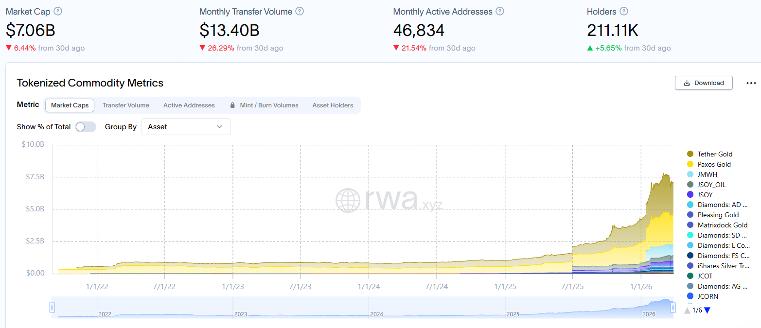 其中,代币化黄金占据主导地位,Tether Gold(XAUT)以25亿美元市值占38%,Paxos Gold(PAXG)以22亿美元占比34%。