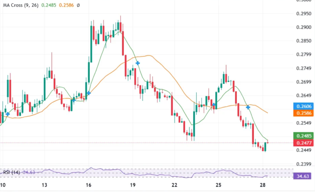 在最近24小时内,卡尔达诺价格再度下挫,周内累计跌幅突破6%,表明抛售压力未见缓解。当前价格在0.25美元高点回落后的窄幅区间内波动,买方力量难以有效突破,市场处于明显的多空拉锯状态。技术指标层面,死亡交叉的出现令部分分析师警惕趋势逆转风险,但也有观点认为,在宏观支撑增强背景下,该形态或构成空头陷阱,存在阶段性反弹机会。