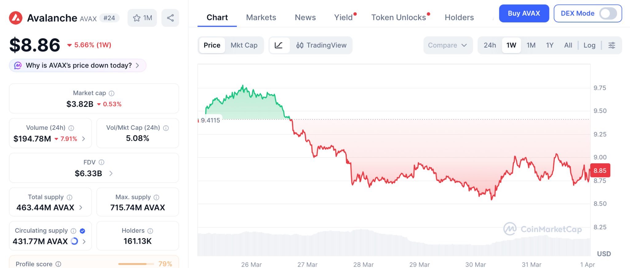 据CoinMarketCap统计,AVAX于3月31日报收8.86美元,较历史峰值下跌超过九成。该资产正经历深度调整。